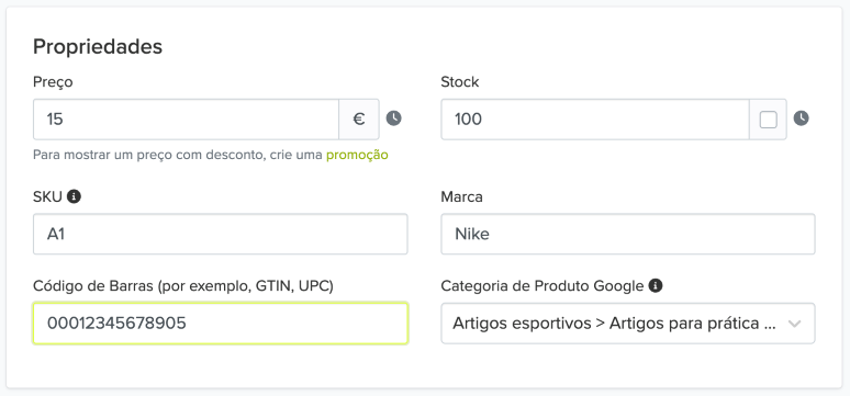 Na seção Propriedades, pode definir o preço, SKU, código de barras, estoque, marca e categoria de produtos Google.